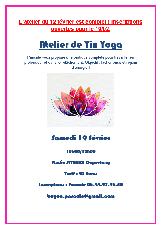Atelier de Yin Yoga Publié parstudiositaaracapestang31 janvier 202231 janvier 2022Publié dansEvenement Atelier de Yin Yoga animé par Pascale le 19 Février 2022 de 10h à 12h Lien de l’événement Facebook : par ici Partager : Cliquer pour partager sur X(ouvre dans une nouvelle fenêtre) X Cliquez pour partager sur Facebook(ouvre dans une nouvelle fenêtre) Facebook J’aime chargement…