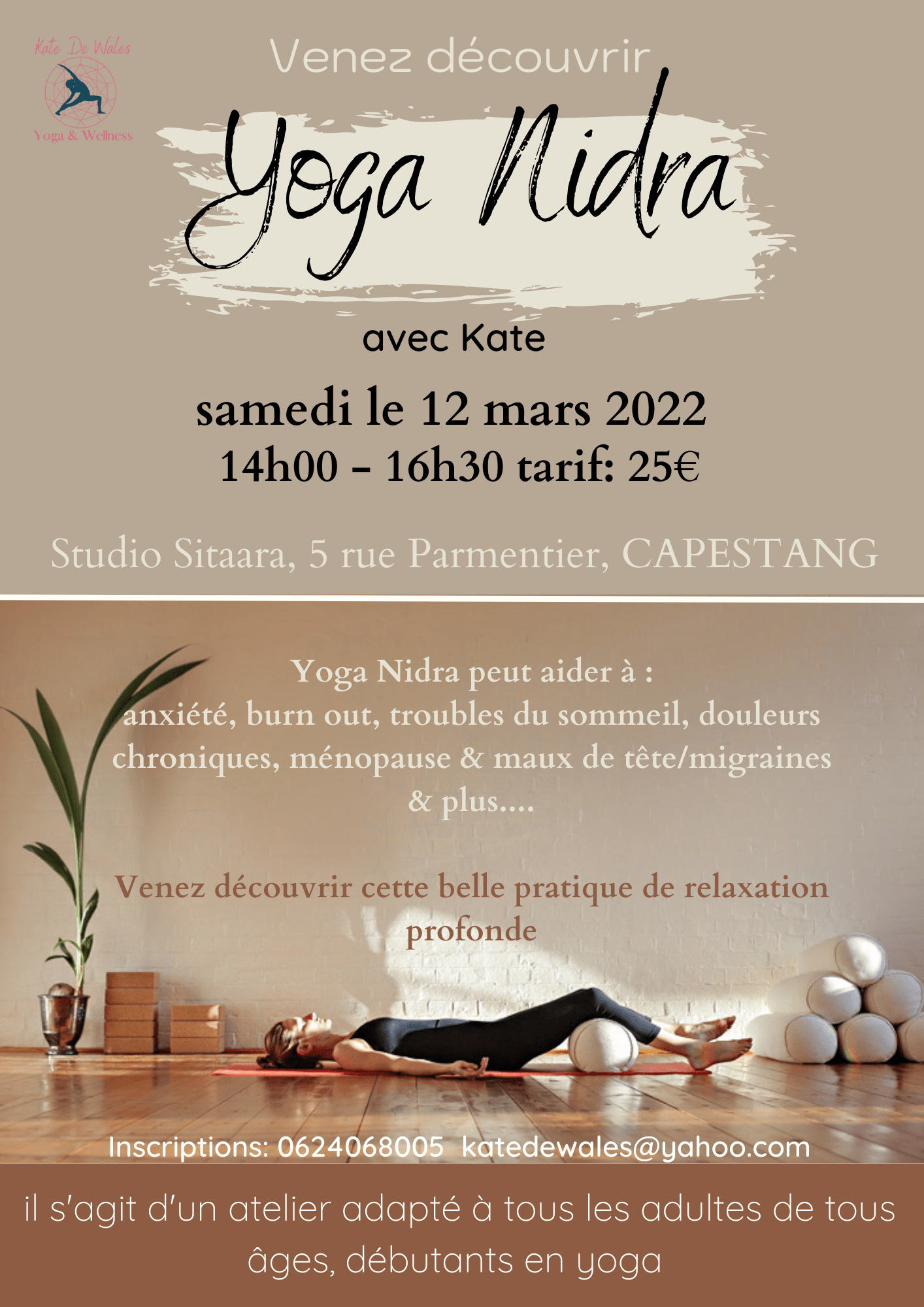 Atelier de Yoga Nidra le 12/03/2022 de 14h à 16h30 Publié parstudiositaaracapestang2 mars 2022Publié dansEvenement Atelier de Yin Nidra animé par Kate le 12 Mars 2022 de 14h à 16h30 Lien de l’événement Facebook : par ici Partager : Cliquer pour partager sur X(ouvre dans une nouvelle fenêtre) X Cliquez pour partager sur Facebook(ouvre dans une nouvelle fenêtre) Facebook J’aime chargement…
