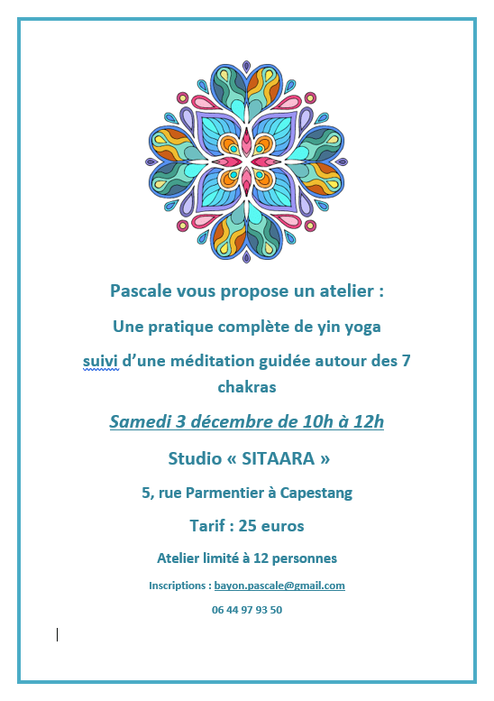 Atelier de Yin Yoga le 03/12/2022 de 10h à 12h Publié parstudiositaaracapestang28 novembre 2022Publié dansEvenement Atelier de Yin Yoga animé par Pascale le 19 Février 2022 de 10h à 12h Lien de l’événement Facebook : par ici Partager : Cliquer pour partager sur X(ouvre dans une nouvelle fenêtre) X Cliquez pour partager sur Facebook(ouvre dans une nouvelle fenêtre) Facebook J’aime chargement…
