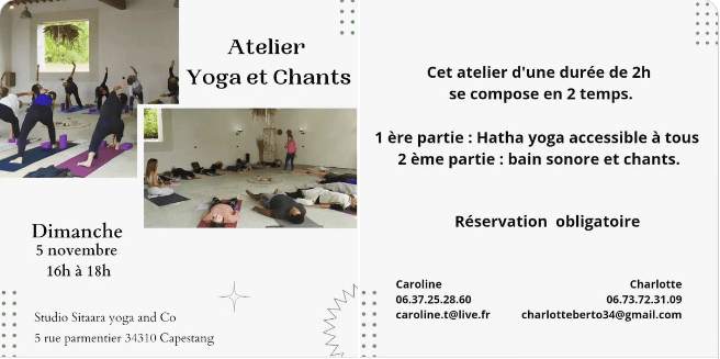 Ateliers « Yoga et chants » le 05 novembre 2023 de 16h à 18h Publié parstudiositaaracapestang30 octobre 2023Publié dansEvenement Partager : Cliquer pour partager sur X(ouvre dans une nouvelle fenêtre) X Cliquez pour partager sur Facebook(ouvre dans une nouvelle fenêtre) Facebook J’aime chargement…